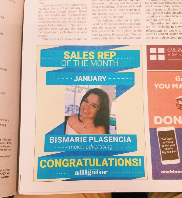 For those of you that don’t know, I am an account executive at the Independent Florida Alligator. This past month of January I was awarded “Sales Representative of the Month.” I was the sales rep the sold the most ads and brought in new business in the month January. It was such a great achievement.