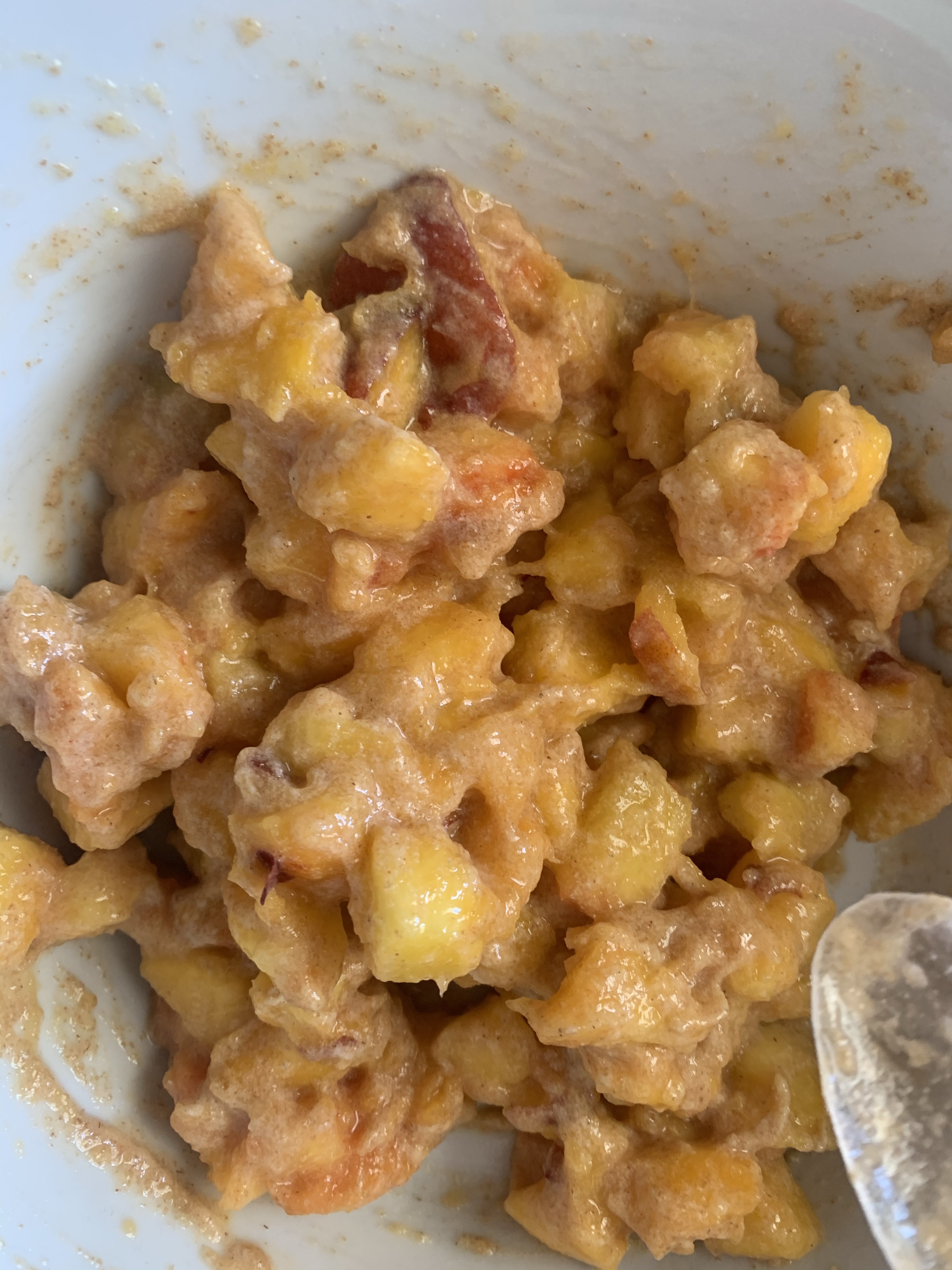 6. In a larger bowl pour in the chopped peaches and rest of the wheat flour. Stir well until all peach pieces are coated entirely.