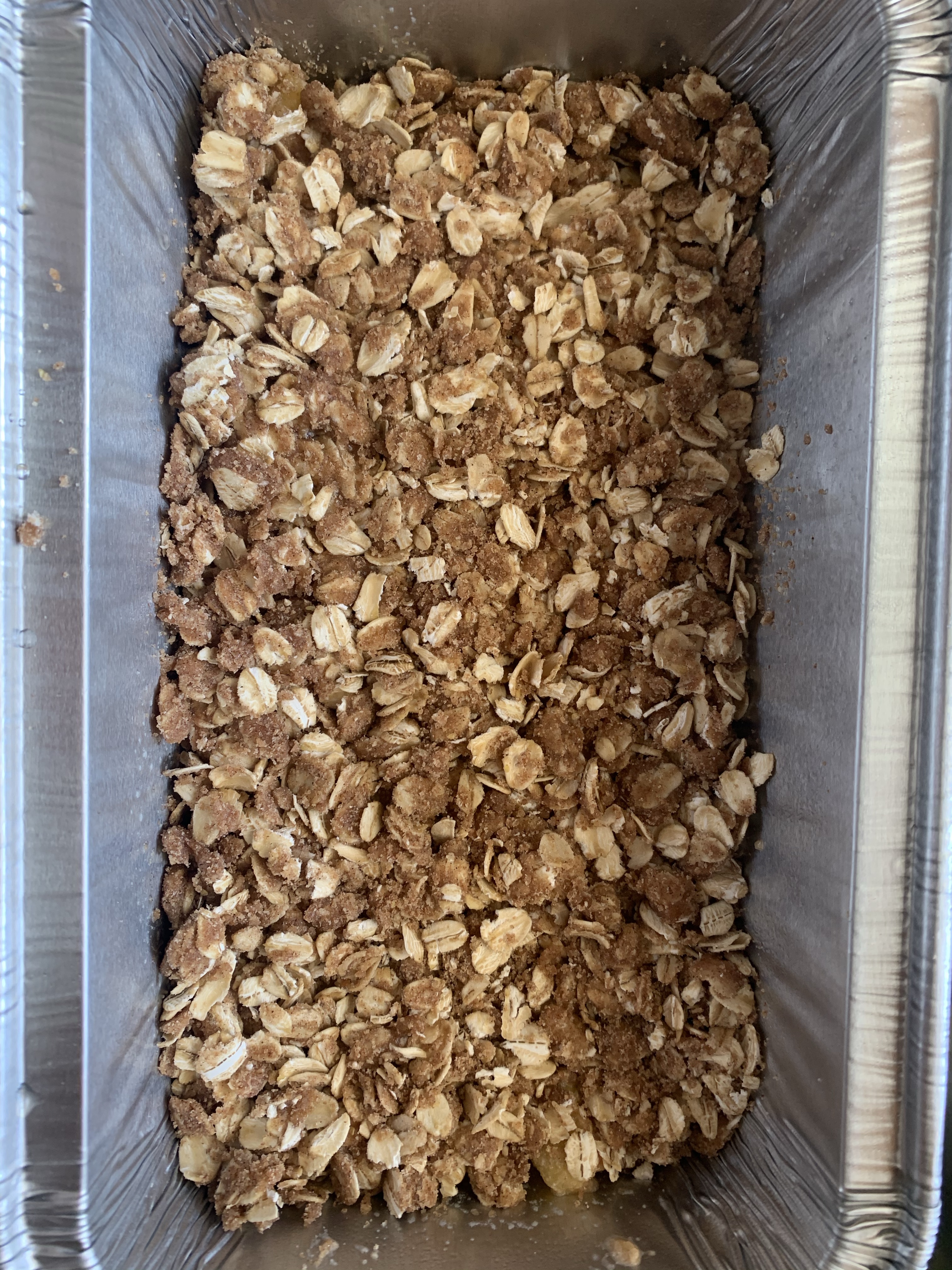 7. Pour the peach filling into the pan, making sure it is spread evenly. Proceed to pour the topping over the peach filling. Even out the topping.