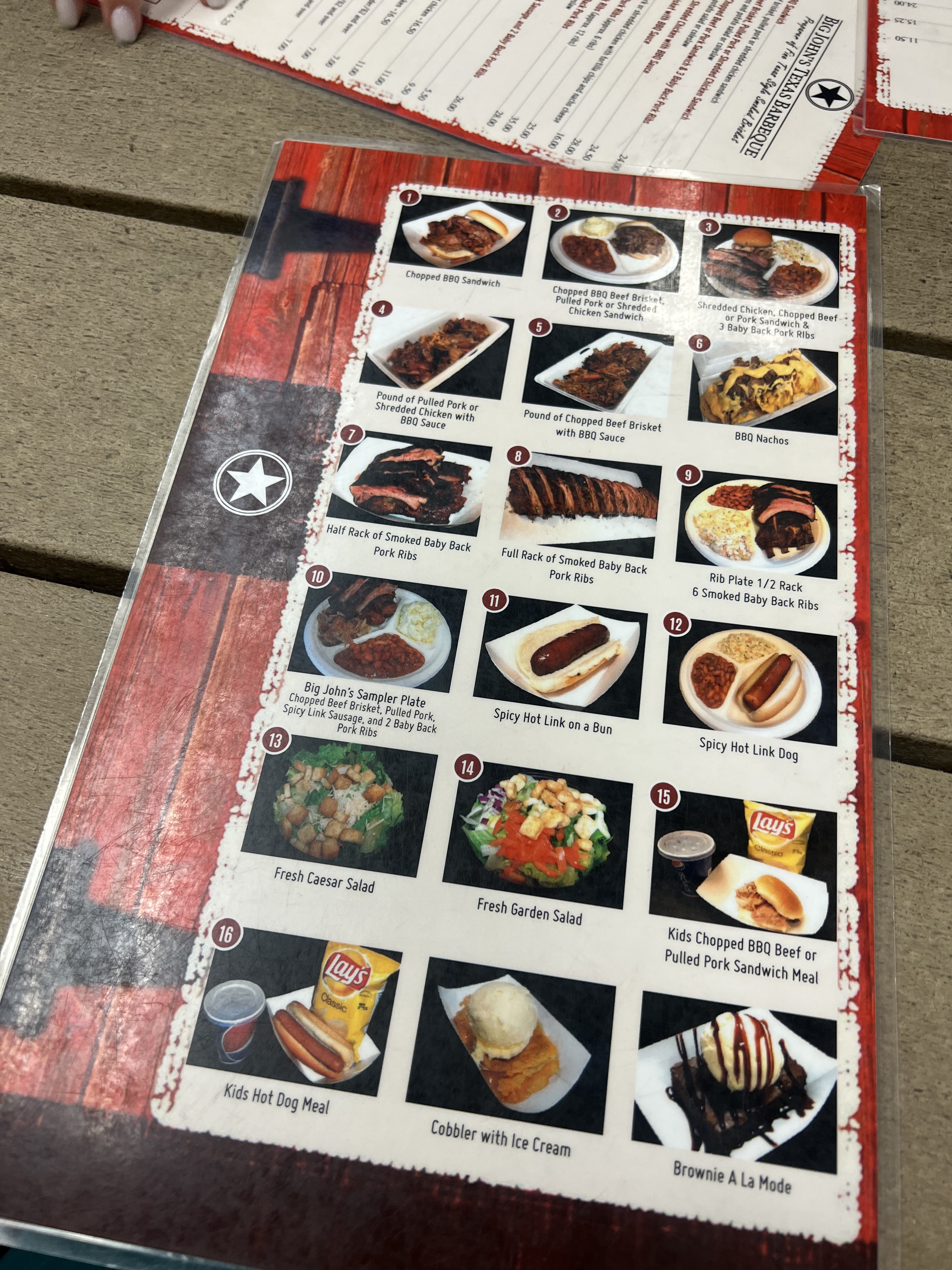 - Eat at Big John’s Texas BBQ for dinner, you will not be disappointed, it was pretty good BBQ. Remember to get the peach cobbler with ice cream to have a sweet end to your day.